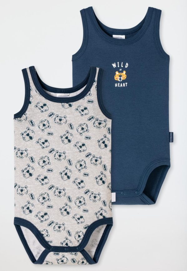 „ROAR“ im Doppelpack! Auf diesen ärmellosen Babybodys für Jungen geht es richtig wild zu. Ob in Dunkelblau mit Tiger-Motiv und coolem Statement-Spruch oder in Grau mit Allover-Muster aus mutigen Raubkatzen – dieses starke Duo ist ein tierischer Hingucker. Das hochwertige Feinripp-Material aus 100% Organic Cotton fühlt sich besonders natürlich und weich auf der empfindlichen Kinderhaut an. Dank hochwertiger Druckknöpfe im Schritt ist das Umziehen ein echtes Kinderspiel. Beste SCHIESSER-Qualität!