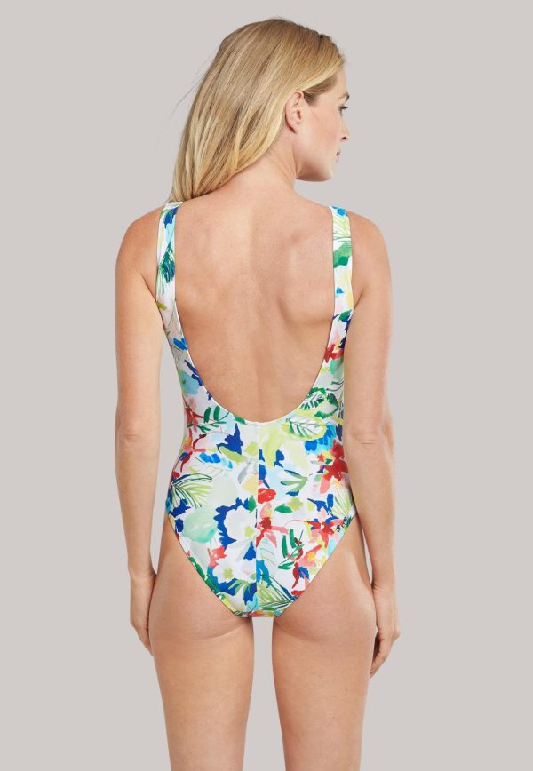 - weißer Badeanzug für Damen mit exotischem Blumenprint in Blautönen, Rot und Grün