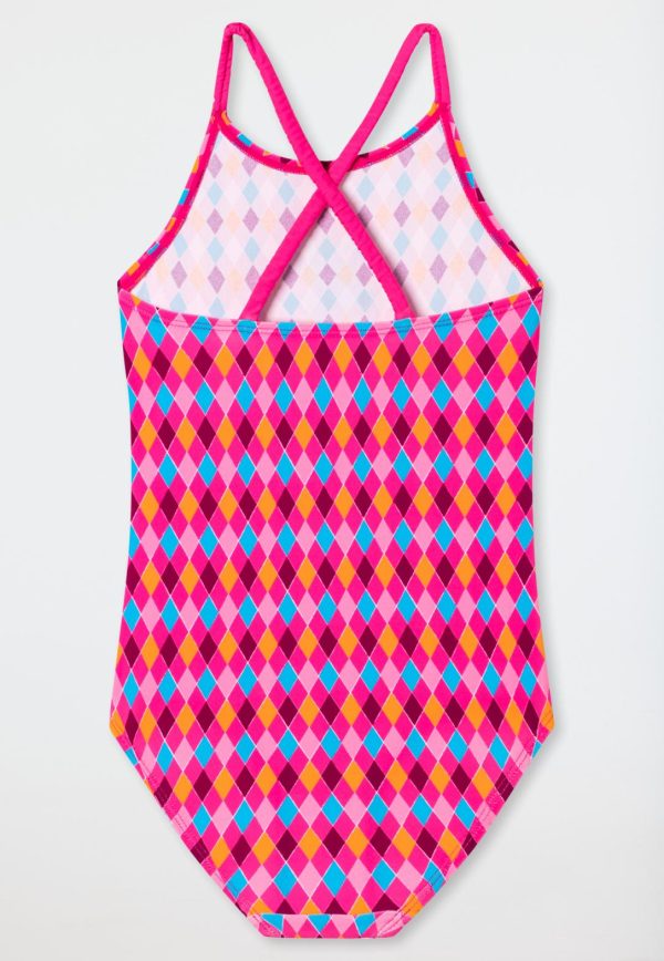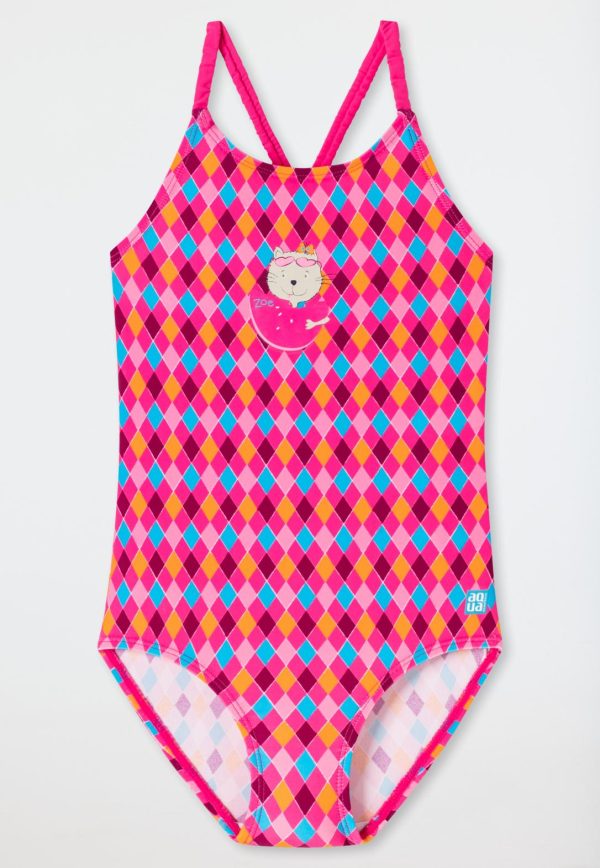 Dieser hübsche Badeanzug lässt alle kleinen Mädchenherzen höher schlagen! Der farbenfrohe Einteiler begeistert nicht nur mit seinem Allover-Muster im Ethno-Look, sondern wird mit niedlicher Cat Zoe samt Wassermelone zum coolen Hingucker. Verstellbare, gerippte Träger in Pink sorgen für einen perfekten Sitz beim Schwimmen und Tauchen. Dank Lichtschutzfaktor 40+ sind die Kleinen bestens vor der Sonne geschützt. Ein echtes Lieblingsteil aus nachhaltiger Wirkware und in bester SCHIESSER-Qualität!