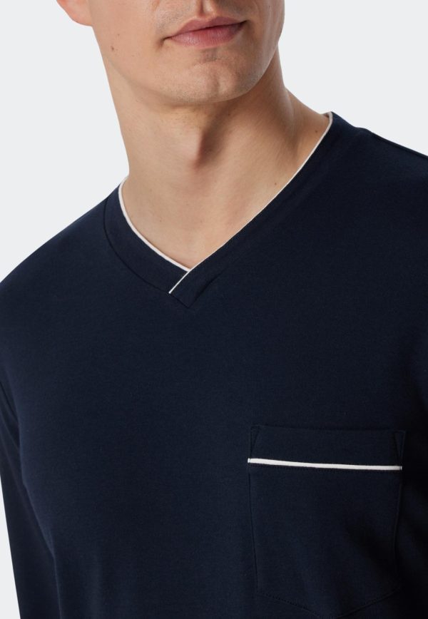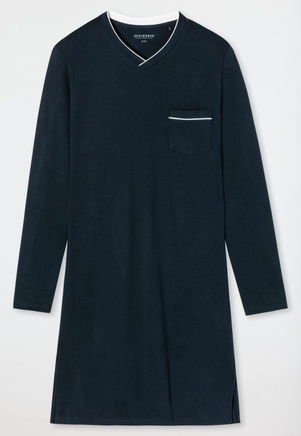Maskulin, komfortabel, unkompliziert – dieses dunkelblaue Herren-Nachthemd erfüllt alle Wünsche. Dank hochwertigem Interlock aus 100% Baumwolle sowie der seitlichen Schlitze am Saum ist das Langarm-Nachthemd besonders bequem. Der V-Ausschnitt sowie eine Brusttasche sind mit weißen Paspeln verfeinert. Ein eleganter Klassiker in bester SCHIESSER-Qualität!