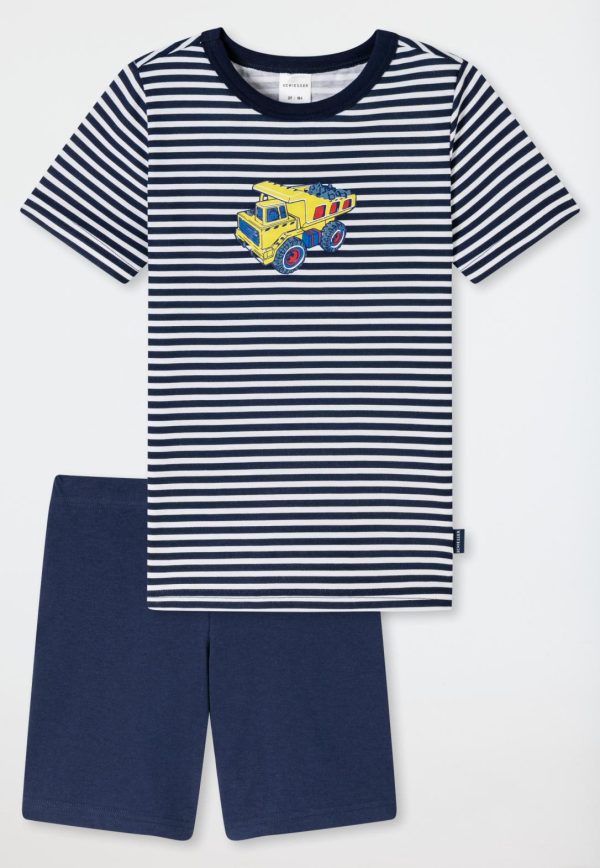 Dieser kurze Schlafanzug bringt alle Jungenaugen zum Leuchten! Das geringelte Oberteil ist ein echter Blickfang unter der Bettdecke und begeistert mit einem extra großem Motiv auf der Brust: Hier sorgt ein cooles Baufahrzeug bei der Arbeit für pure Begeisterung. In der dunkelblauen kurzen Schlafhose mit komfortablen Bund können kleine Wildfänge sich rundum wohlfühlen. 100% Organic Cotton umschmeichelt die zarte Kinderhaut und sorgt für garantiert entspannte Nächte in bester SCHIESSER-Qualität!