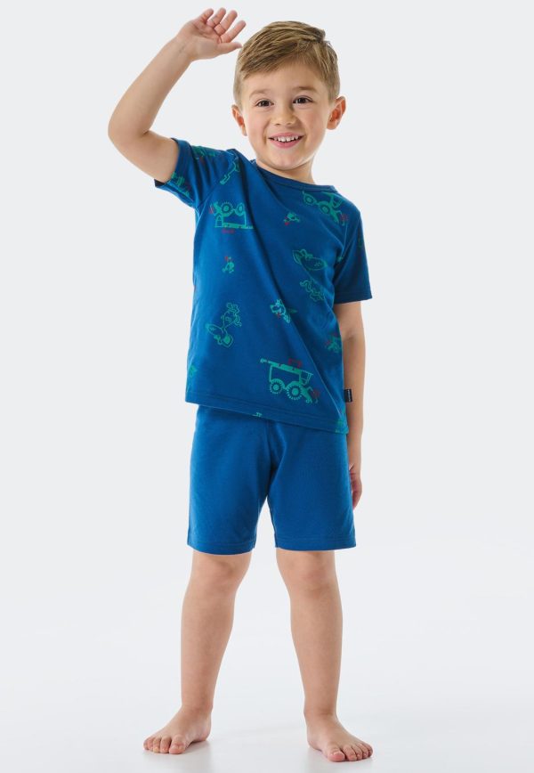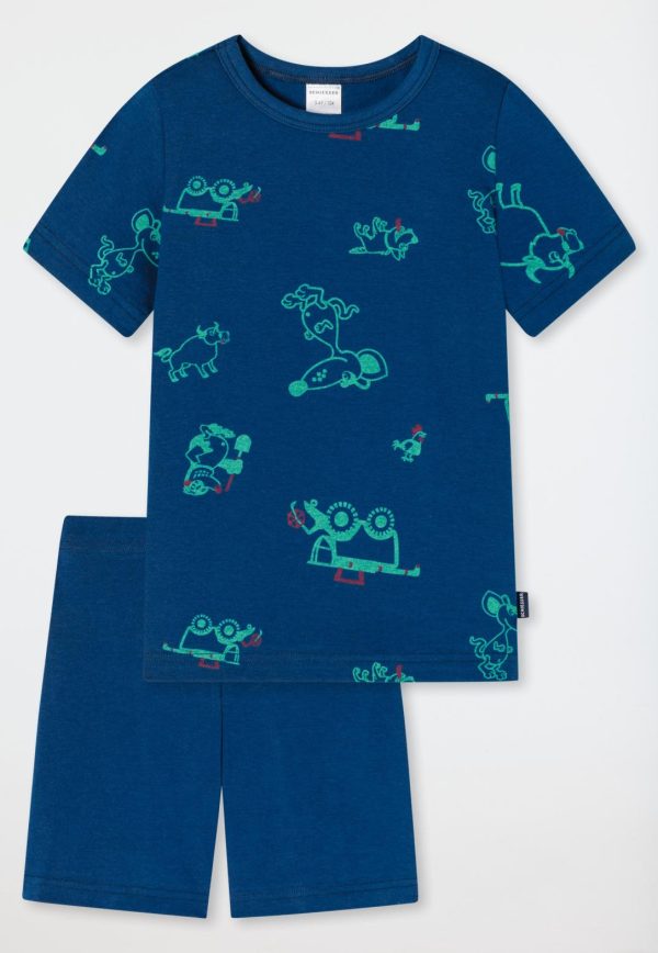 Aufgepasst, hier kommt euer neuer kurzer Jungenschlafanzug in coolem Dunkelblau! Das Oberteil im lässigen Schnitt begeistert mit einem tierischen Allover-Muster in Grün: Witzige Farm-Tiere und Landmaschinen sorgen hier für gute Laune beim Zubettgehen. Das Single Jersey-Material aus 100% softer Bio-Baumwolle fühlt sich zudem herrlich weich auf der Haut an. Die dunkelblauen Schlafshorts sitzen dank Softbund rundum bequem. Ein toller Zweiteiler für kleine Wildfänge in bester SCHIESSER-Qualität.