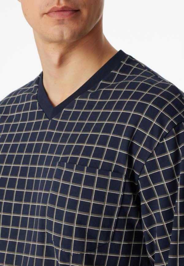 Hoher Tragekomfort steht ganz im Fokus dieses langen, dunkelblauen Schlafanzugs für Herren. Feiner Jersey aus 100% Baumwolle fühlt sich dabei angenehm weich an und wird mit den Bündchenabschlüssen stimmig abgerundet. Und auch optisch kann der Zweiteiler punkten: Weiß-blaue Karos schenken dem Oberteil einen maskulinen Charakter und bekommen mit der aufgesetzten Brusttasche ein feines Details. Genau das Richtige für Herren, die auch nachts nicht auf beste SCHIESSER-Qualität verzichten möchten!