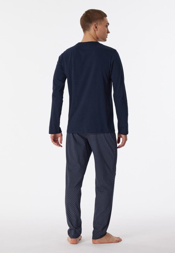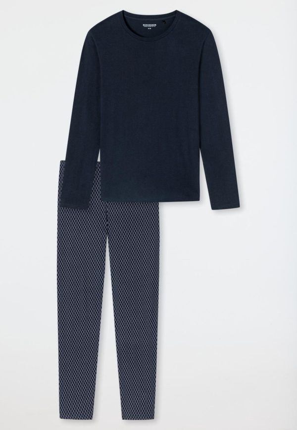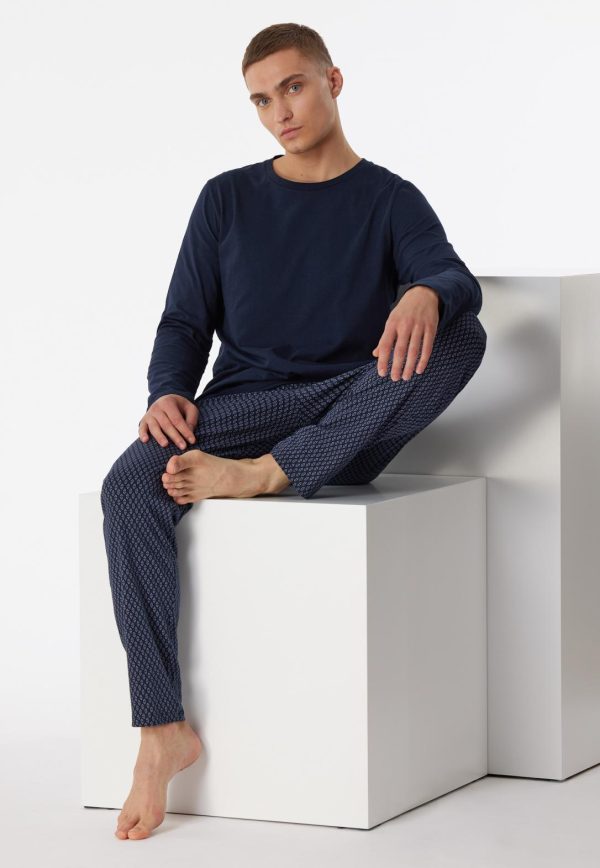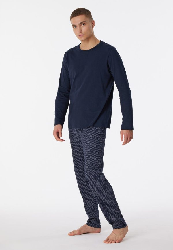 - langer Herren-Schlafanzug mit nachtblauem Oberteil und gemusterter Hose in Nachtblau und Weiß