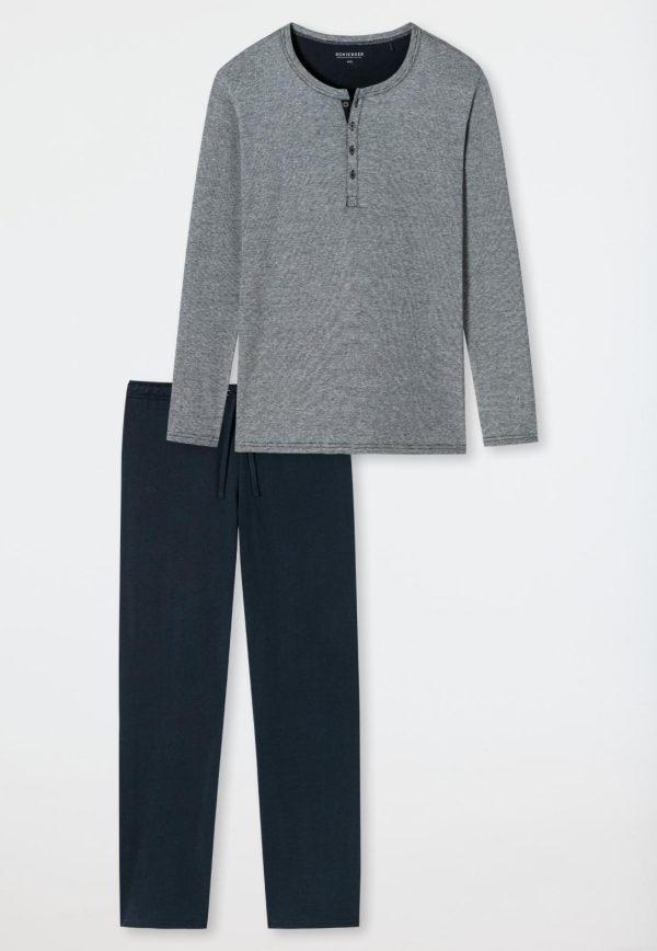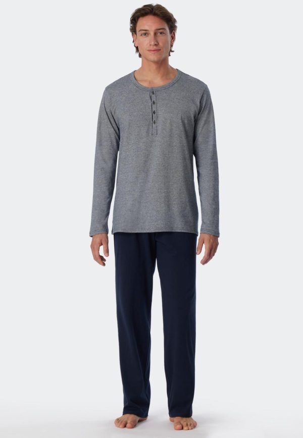 Im sportlichen Look und 100% weicher Baumwolle punktet dieser lange Schlafanzug bei anspruchsvollen Herren. Ein Serafino-Kragen mit Knopfleiste schenkt dem Oberteil mit blau-weißen Fineliner-Ringeln ein dezentes Detail, das in der langen blauen Hose ein stimmiges Pendant erhält. Lockerleichter Single Jersey übernimmt den komfortablen Part und macht den Zweiteiler besonders bequem. Genau das Richtige für Herren, die entspannte Nächte am liebsten in bester SCHIESSER-Qualität genießen!