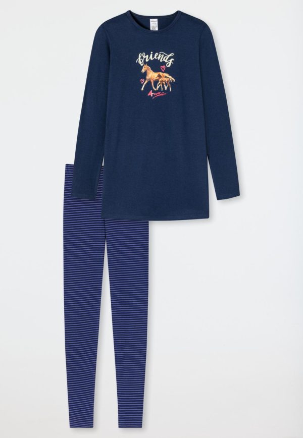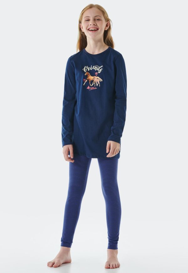 - langer Schlafanzug für Mädchen in Dunkelblau mit lila-geringelter Leggings