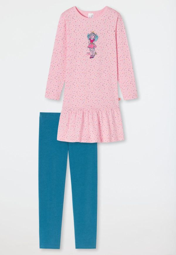 Darf ich bitten? Dieser hübsche lange Mädchenschlafanzug aus der beliebten Nachtwäsche-Serie „Prinzessin Lillifee“ bezaubert alle kleinen Traumtänzerinnen. Im hübschen Tupfen-Look und mit extra Rüschen am Saum ist das Oberteil in Rosa ein echter Blickfang. Auf der Brust strahlt uns Lillifee lässig mit coolen Gold-Glitzer-Effekten entgegen. Die bequeme Leggings in Petrol und 100% Organic Cotton laden zum Kuscheln und Entspannen ein. Wunderschön verspielt in bester SCHIESSER-Qualität!