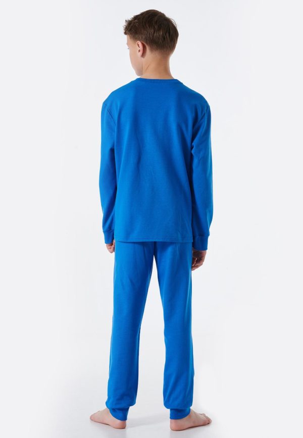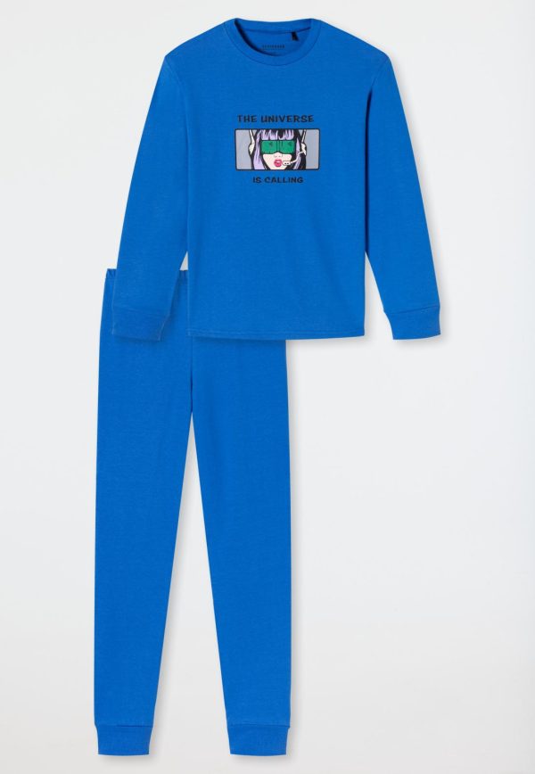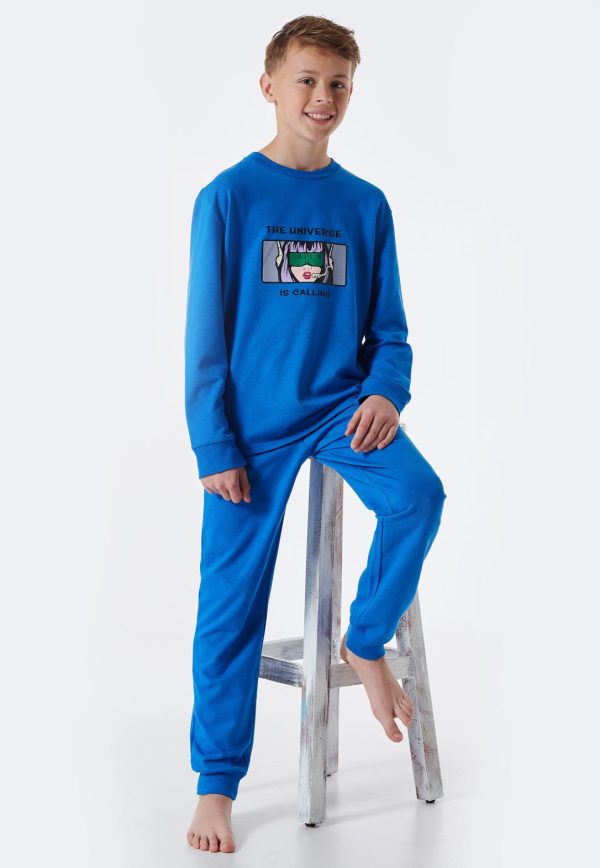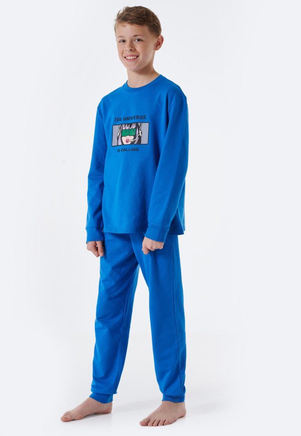 - langer, blauer Jungenschlafanzug mit nachtblauem „THE UNIVERSE IS CALLING“-Schriftzug und Printmotiv