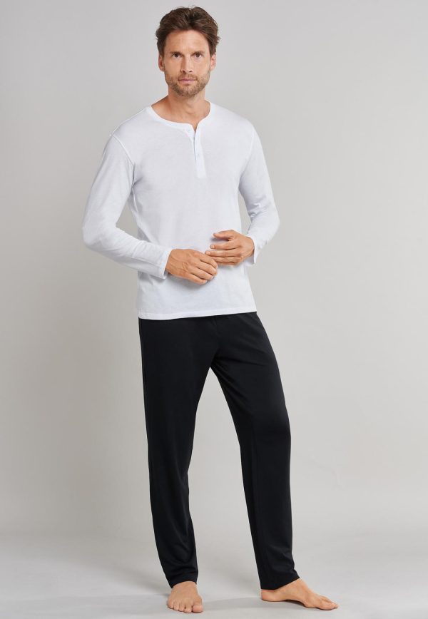 Dieses weiße Herren-Langarmshirt aus der beliebten Mix+Relax Serie strahlt pure Lässigkeit aus! Der Serafino-Kragen mit funktionaler Knopfleiste schenkt dem Longsleeve dabei seinen typischen Henley-Charakter. Dank weichem Single Jersey aus 100 % Baumwolle ist für hohen Tragekomfort gesorgt. Genau das Richtige für entspannte Tage und Nächte – natürlich in bester SCHIESSER-Qualität!