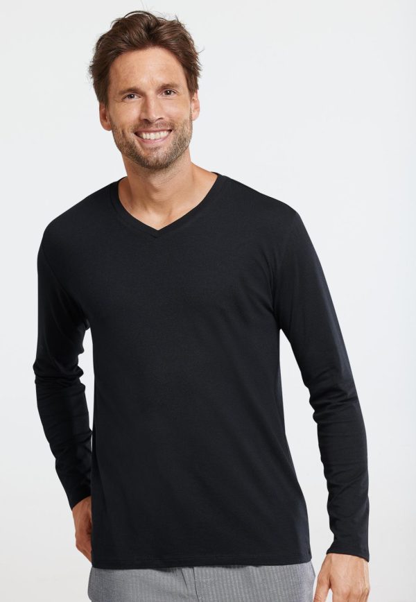 Dieses schwarze Herren-Langarmshirt ist weit mehr als ein simples Basic! Fließend weicher Single Jersey aus Baumwolle und Modal verspricht dabei höchsten Tragekomfort, fühlt sich angenehm glatt an und bleibt dank 5 % Elastan jederzeit in Topform. Der V-Ausschnitt unterstreicht den männlichen Look. Ein authentisches, bequemes T-Shirt in bester SCHIESSER-Qualität!