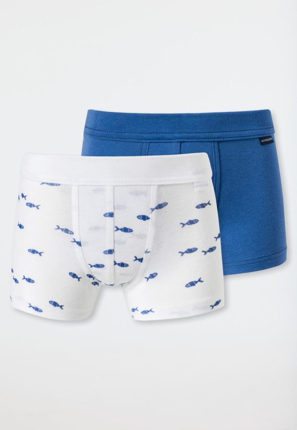 Aufgepasst, ihr kleinen Wildfänge – hier kommen eure neuen Jungen-Shorts im praktischen Doppelpack! In Weiß mit fröhlichem Fischschwarm-Allover und unifarben in klassischem Blau ist das starke Tagwäsche-Duo ein tierischer Hingucker. Das hochwertige Feinripp-Material aus 100% hautfreundlicher Bio-Baumwolle und der extra Softbund sorgen für jede Menge Tragekomfort. Perfekt sitzend und herrlich bequem in bester SCHIESSER-Qualität!