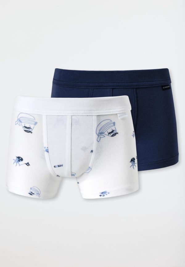 Aufgepasst, ihr kleinen Abenteurer – hier kommen eure neuen Jungen-Shorts im praktischen Doppelpack! In Weiß mit fröhlichem Piraten-Allover und unifarben in klassischem Dunkelblau ist das starke Tagwäsche-Duo ein cooler Hingucker. Das hochwertige Feinripp-Material aus 100% hautfreundlicher Bio-Baumwolle und der extra Softbund sorgen für jede Menge Tragekomfort. Perfekt sitzend und herrlich bequem in bester SCHIESSER-Qualität!