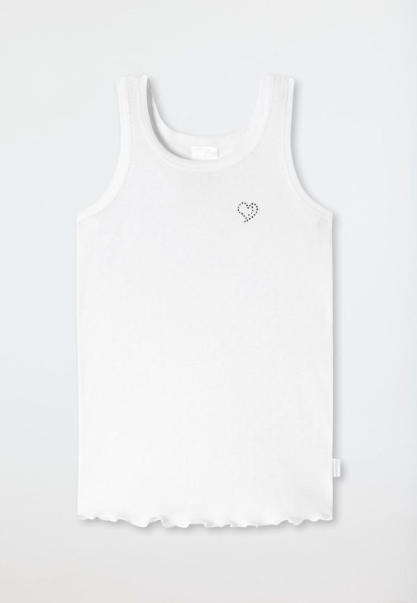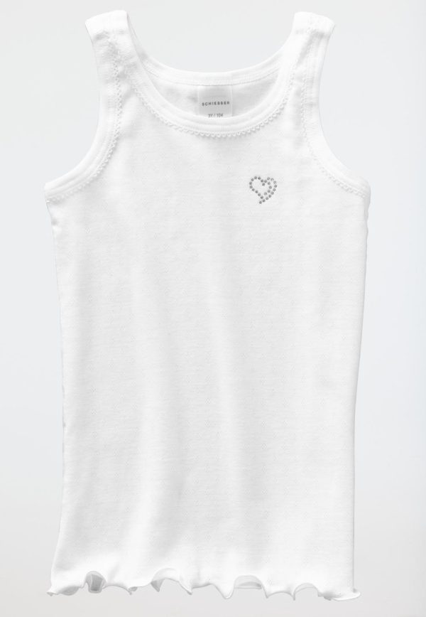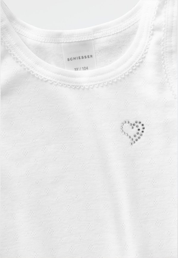 Lieblingswäsche zum Wohlfühlen: Dieses weiße Unterhemd bringt mit seinem hübschen Design Mädchenaugen zum Leuchten! Ein feines Ajourée-Lochmuster, das funkelnde Swarovski®-Herzchen auf der Brust, verzierte Ausschnitte und der liebevolle Rollsaum sehen dabei nicht nur zauberhaft aus, sondern fühlen sich in hochwertigem Feinripp aus 100% Baumwolle zudem streichelweich auf der Haut an. Ein wunderbar bequemes Hemdchen in bewährt bester SCHIESSER-Qualität!