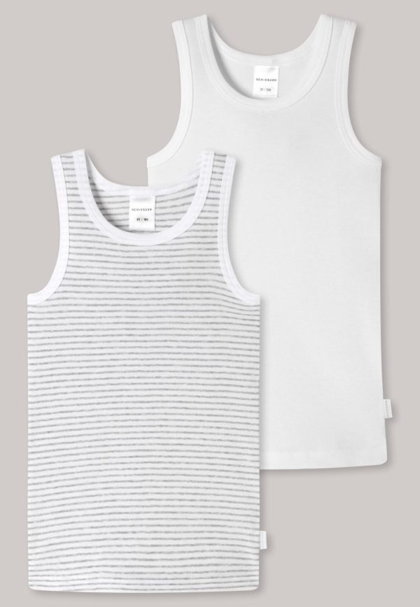 Rundum natürlich und herrlich bequem sind diese beiden Jungenunterhemden im praktischen Doppelpack! Ob im klassischem Weiß oder hübsch geringelt in zartem Grau – dieses Tagwäsche-Duo ist ein echter Alleskönner. Dank weichem Feinripp-Material aus 100% atmungsaktivem Organic Cotton sitzen die Hemdchen beim Spielen und Toben perfekt am Körper – nachhaltig, hautfreundlich und in jeder Menge bester SCHIESSER-Qualität!
